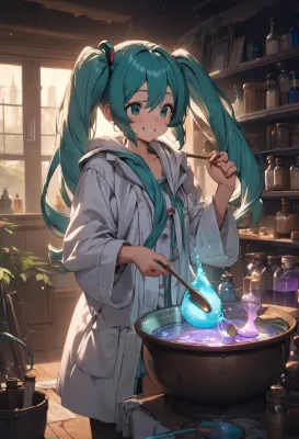 masterpiece, best quality, extremely detailed, anime, girl, Hatsune Miku, VOCALOID, long twintails in teal, skirt, girl wearing round glasses and white coat, beauty, cute, smiling, creating suspicious potion in a large cauldron, shelves lined with bottles of herbs, dimly lit room in an old hospital, mad doctor, dark fantasy, horror