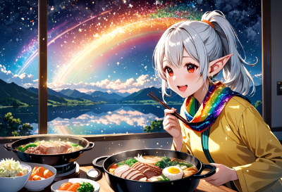 8K,((cinematic light,masterpiece,best quality,Ultra extremely detailed,perfect anatomy,detailed,high-resolution,highres,extremely detailed,sharp focus:1.5)),((high-contrast:1.6,strong back-light,close-up , from_above:1.5,back,flower print , child elf wearing glossy decoration glitter light yellow suit with brilliant sequins and flills,short skirt,yellow brilliant gawn,rainbow silk scarf)),looking at viewer:1.5, ((extra detailed red Eyes with reflection)), glitter waving shining ponytail:1.5, (white hair with curly),elf ear with big earrings,big smile,wide open mouth,blush,lipstick,full fresh lips,wet-lip,big hip,big small breasts,armpit,ponytail,BREAK,in room,sikent lake, in room,galaxy,night sky,shooting stars, round many stars,birds,glitter city in the distance,dark cloud, big white roses,<lora:hohoaka:1> <lora:make25d_type1_v100:1>,,,,