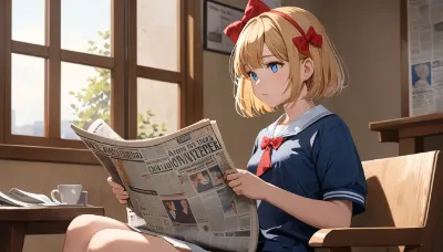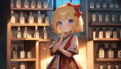 2 girls,small girls,blonde hair,blue eyes,short bob hairstyle,(hair bow:1.4),red bow,black hair,long straight hair,curious expressions,slightly tilted heads,wearing traditional Japanese festival yukata,vibrant patterns,standing side by side,holding small purses,gazing intently at a cotton candy stand,colorful cotton candy displayed,softly glowing lanterns,lively festival atmosphere,other stalls and decorations in the background,warm evening lighting,faint glow from the lanterns,joyful and nostalgic feeling,masterpiece,best quality,very aesthetic,absurdres,