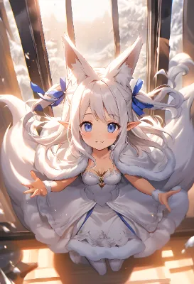 girl, medium breasts, two side up, cute, (white hair), long hair, long white princess dress, long white ruffled skirt, frills,skirt spread out、 white Cape, ruffle Cape, fur Cape, white calf socks, braided boots, bash, blue eyes, parted lips, pointy ears, fox ears, fox tail, fluffy tail, hair ribbon, blue ribbon,,,,