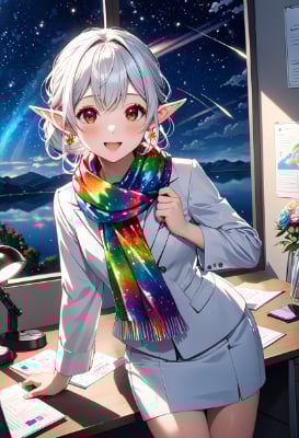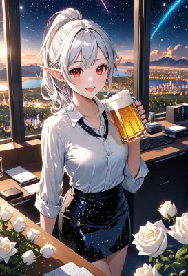 8K,((cinematic light,masterpiece,best quality,Ultra extremely detailed,perfect anatomy,detailed,high-resolution,highres,extremely detailed,sharp focus:1.5)),((high-contrast:1.6,strong back-light,close-up , from_above:1.5,back,flower print , child elf wearing glossy decoration glitter light office-suit with brilliant sequins ,short skirt,shirt,white blouse,rainbow silk scarf,suit)),looking at viewer:1.5, ((extra detailed red Eyes with reflection)), glitter waving shining ponytail:1.5, (white hair with curly),elf ear with big earrings,big smile,wide open mouth,blush,lipstick,full fresh lips,wet-lip,big hip,big small breasts,armpit,ponytail,in room,BREAK,beer- mug,office room,sikent lake, in room,galaxy,night sky,shooting stars, round many stars,birds,glitter city in the distance,dark cloud, big white roses,<lora:hohoaka:1> <lora:make25d_type1_v100:1>,,,,