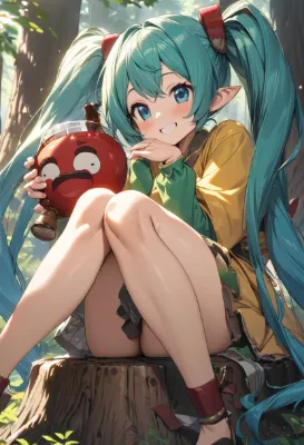 masterpiece, best quality, extremely detailed, anime, girl, Hatsune Miku, VOCALOID, long twintails in blue-green color, two-tone hair, skirt, girl, elf girl in yellow clothes, beautiful, cute, smiling, full moon night, in the forest, sitting on a thick tree branch drinking a glass of wine, cherry blossoms blooming, fantasy