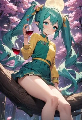 masterpiece, best quality, extremely detailed, anime, girl, Hatsune Miku, VOCALOID, long twin-tails in teal color, two-tone hair, blue eyes, girl in red hakama and white kimono with fox ears and tail, carrying a cup of sake with a gourd hanging from her waist, innocently smiling, beautiful girl, cute, smiling, traditional Japanese style, watercolor, cherry blossoms blooming, flower viewing, hanami sake.