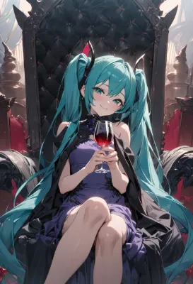 masterpiece, best quality, extremely detailed, anime, girl, Hatsune Miku, VOCALOID, long twin-tails in teal color, sitting on a throne holding a glass of red wine, wearing a black cape and a purple dress, beautiful girl, smiling innocently, demon king, dark fantasy