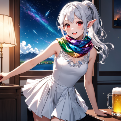 8K,((cinematic light,masterpiece,best quality,Ultra extremely detailed,perfect anatomy,detailed,high-resolution,highres,extremely detailed,sharp focus:1.5)),((high-contrast:1.6,strong back-light,close-up , from_above:1.5,back,flower print , child elf wearing glossy decoration glitter light perl white one-piece skirt with brilliant sequins ,see-through rainbow scarf,suit)),looking at viewer:1.5, ((extra detailed red Eyes with reflection)), glitter waving shining ponytail:1.5, (white hair with curly),elf ear with big earrings,big smile,wide open mouth,blush,lipstick,full fresh lips,wet-lip,big hip,big small breasts,armpit,ponytail,in room,drink,BREAK,beer- mug,office room,sikent lake, in room,galaxy,night sky,shooting stars, round many stars,birds,glitter city in the distance,dark cloud, big white roses,<lora:hohoaka:1> <lora:make25d_type1_v100:1>,,,,