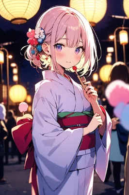 Best Quality, masterpiece, High sensitivity, High resolution, Detailed Description, Delicate facial depiction, Slender women, Colorful cotton candy, a pretty woman, わたあめ, maturi, 8k, high resolution, pastel colour, soft light, <lora:saturation:0.2>, festival