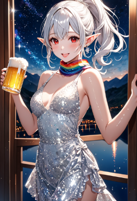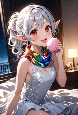 8K,((cinematic light,masterpiece,best quality,Ultra extremely detailed,perfect anatomy,detailed,high-resolution,highres,extremely detailed,sharp focus:1.5)),((high-contrast:1.6,strong back-light,close-up , from_above:1.5,back,flower print , child elf wearing glossy decoration glitter light perl white one-piece skirt with brilliant sequins ,see-through rainbow scarf,suit)),looking at viewer:1.5, ((extra detailed red Eyes with reflection)), glitter waving shining ponytail:1.5, (white hair with curly),elf ear with big earrings,big smile,wide open mouth,blush,lipstick,full fresh lips,wet-lip,big hip,big small breasts,armpit,ponytail,in room,eating,BREAK,((cotton-candy)),matsuri,sikent lake, in room,galaxy,night sky,shooting stars, round many stars,birds,glitter city in the distance,dark cloud, big white roses,<lora:hohoaka:1> <lora:make25d_type1_v100:1>,,,,