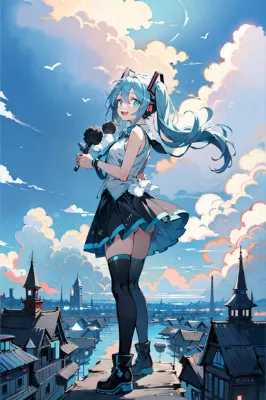 masterpiece, best quality, extremely detailed, anime, girl, Hatsune Miku, VOCALOID, long twin tails in light blue, mini skirt, girl, tie, headphones, sleeveless, black arm covers, black long boots, beautiful girl, cute, smiling, fluffy cotton candy-like clouds, holding colorful cotton candy and innocently laughing, rainbow, castle in the clouds, fantasy, <lora:floatingmix2:1>, <lora:gloweyes_v100:1>