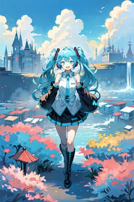 masterpiece, best quality, extremely detailed, anime, girl, Hatsune Miku, VOCALOID, long twin tails in light blue, mini skirt, girl, tie, headphones, sleeveless, black arm covers, black long boots, beautiful girl, cute, smiling, fluffy cotton candy-like clouds, holding colorful cotton candy and innocently laughing, rainbow, castle in the clouds, fantasy, <lora:floatingmix2:1>, <lora:gloweyes_v100:1>