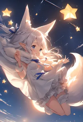 girl, medium breasts, two side up, cute, (white hair), long hair, long white princess dress, long white ruffled skirt, frills, skirt spread out、 white Cape, ruffle Cape, fur Cape, white calf socks, braided boots, bash, blue eyes, parted lips, pointy ears, fox ears, fox tail, fluffy tail, hair ribbon, blue ribbon,,,,