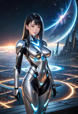 (photorealistic:1.4), (RAW photo), masterpiece, best quality, extremely detailed, lady, (cyborg:1.1), neat and clean, elegant, polite, shy, black long hair, almond eyes, smile, (luminescent, fluorescent, phosphorescent:1.1) (mechanical body suit:1.4), high neck, full sleeves, mechanical stomach, (metallic parts:1.2), breastplate, nipple shield, long gloves, knee high boots, standing, (cosmic world, futuristic city:1.2), steampunk