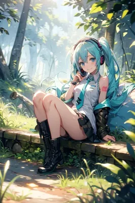 Hatsune Miku, VOCALOID, blue-green long twin tail, blue eyes, miniskirt, sleeveless, necktie, headphones, black arm covers, black long boots, beautiful girl, cute, smiling, laughing innocently, ancient city covered in moss in the woods, soft sunlight shines in and fantastic firefly light is flying, fantastic, mystical, fantasy