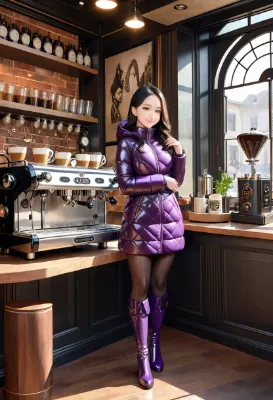 (photorealistic:1.4), (RAW photo), masterpiece, best quality, extremely detailed, lady, neat and clean, elegant, polite, shy, black long hair, almond eyes, smile, slim fit, hooded, high neck, (shiny light blue puffer down jacket:1.2), (royal blue knee length flare skirt:1.1), nylon pantyhose, (enamel long boots:1.3), chic cafe, (steampunk mechanical espresso machine:1.2)