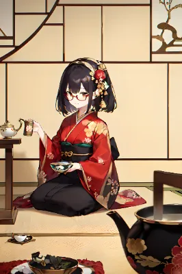 masterpiece, best quality, best quality drawn, (an anime girl in kimono), (((red Kimono with and black floral pattern))), White socks, (black hair), bob cut, black eyes, wearing glasses, cool face, small breasts, slender body, (((with green tea in a gold tea bowl in both hands))), Long kimono hem, (gold Cauldron on Red felt carpet), ((hanging scroll)), (Sitting on Red felt carpet), ((seiza)), (((Red carpet))), (((dark and narrow golden Japanese tea room))), indoors. extremely detailed, Documentary, ((((Inside dark and golden Hermitage)))), ((((golden wall)))), (((golden Japanese tea room dark and narrow golden Hermitage background))), Japanese tea ceremony, (((pitch darkness))) <lora:saturation:-0.55> <lora:yawanuri:1> ,,