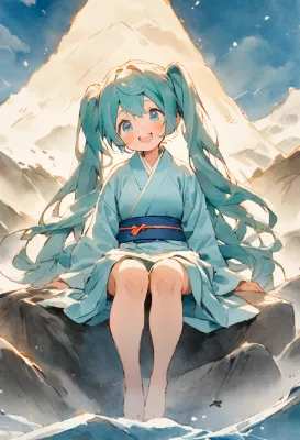 masterpiece, best quality, extremely detailed, anime, girl, Hatsune Miku, VOCALOID, long twintails in aqua color, girl with clear blue eyes, girl wearing a sky-blue kimono bigger than a mountain, beautiful girl, cute, smiling, sitting on a mountain innocently laughing, blue sky, giant girl, Japanese style, watercolor