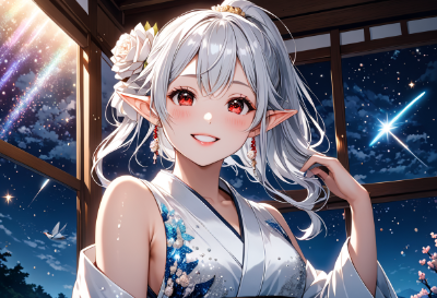 8K,((cinematic light,masterpiece,best quality,Ultra extremely detailed,perfect anatomy,detailed,high-resolution,highres,extremely detailed,sharp focus:1.5)),((high-contrast:1.6,strong back-light,close-up , from_above:1.5,back,flower print , child elf wearing glossy decoration glitter light perl white kimono with brilliant sequins ,)),looking at viewer:1.5, ((extra detailed red Eyes with reflection)), glitter waving shining ponytail:1.5, (white hair with curly),elf ear with big earrings,big smile,wide open mouth,blush,lipstick,full fresh lips,wet-lip,big hip,big small breasts,armpit,ponytail,in room,BREAK,Japanese room,zashiki,silent lake, filled machine in room,galaxy,night sky,shooting stars, round many stars,birds,glitter city in the distance,dark cloud, big white roses,<lora:hohoaka:1> <lora:make25d_type1_v100:1>,,