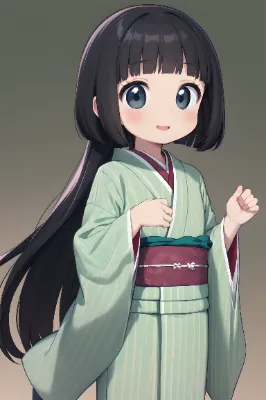 12 years old, young girl, very long black hair with mint green stripe, black eyes, flat chest, straight across bangs, princess cut, very long sideburns, round head with drooping eyes, cute and meek expression, bob cut with long back hair, wearing a kimono, smiling, mascot character