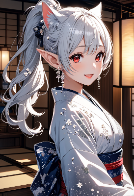 8K,((cinematic light,masterpiece,best quality,Ultra extremely detailed,perfect anatomy,detailed,high-resolution,highres,extremely detailed,sharp focus:1.5)),((high-contrast:1.6,strong back-light,close-up , from_above:1.5,back,flower print , child elf wearing glossy decoration glitter light perl white china-dress with brilliant sequins ,)),looking at viewer:1.5, ((extra detailed red Eyes with reflection)), glitter waving shining ponytail:1.5, (white hair with curly),elf ear with big earrings of mascot-character of cat big smile,wide open mouth,blush,lipstick,full fresh lips,wet-lip,big hip,big small breasts,armpit,ponytail,in room,BREAK,((mascot- character)),Japanese room,zashiki,silent lake, filled machine in room,galaxy,night sky,shooting stars, round many stars,birds,glitter city in the distance,dark cloud, big white roses,<lora:hohoaka:1> <lora:make25d_type1_v100:1>,,,,,