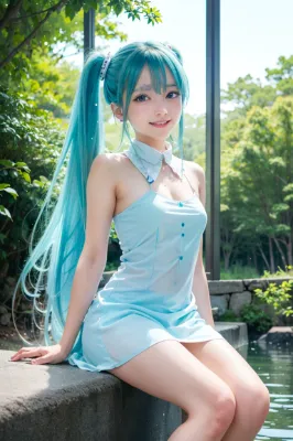 masterpiece, best quality, extremely detailed, anime, girl, skirt, Hatsune Miku, VOCALOID, long twintails in clear aquamarine color, clear transparent blue eyes, sitting in a forest with sunlight filtering through the trees, water, wearing a white dress, beautiful girl, cute, sparkling water splashes, smiling, blue butterflies flying, dreamy, mysterious, fantasy, shining droplets from wet hair and body illuminated by sunlight through the trees