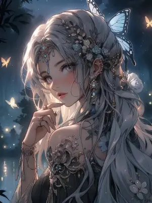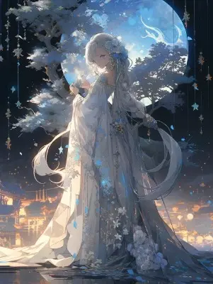 On a night when the moon shines brightly, a noble lady sits on a cloud and gazes up at the stars. Her beautiful face and brightly colored shining eyes. Pale and shining in the moonlight. Her hair fluttering in the wind. The detailed drawing. Vivid colors. High image quality. --s 1000 --ar 3:4 --niji 5