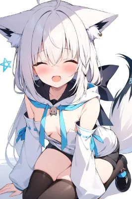 Illustrious,Illustration,White hair,long hair,cat ears,blue-purple eyes,facing viewer,white background,blue square hair accessories,white cat ears,white T-shirt,front view,:),