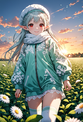 8K,((cinematic light,masterpiece,best quality,Ultra extremely detailed,perfect anatomy,detailed,high-resolution,highres,extremely detailed,sharp focus:1.5)),((high-contrast:1.6,strong back-light, close_up head:1.6,flower print ,Exorcist child elf wearing glossy decoration glitter light dark gothic-dress with brilliant sequins,short skirt,black knit hat with skull print)),looking at viewer:1.5, ((extra detailed red Eyes with reflection)), glitter waving shining messy:1.5, (very long white messy twin-tails hair with curly),elf ear with big earrings ,wit face,blush,lipstick,full fresh lips,wet-lip,big hip,big small breasts,armpit,kick, (((Musical instrument ))),in bar,BREAK,sunrise,shining lights,guiter,BREAK,in cemetery,strong lightning effect,Scythe,silent lake, galaxy,night sky,shooting stars,birds,glitter city in the distance,dark cloud, big white roses,<lora:hohoaka:1> <lora:make25d_type1_v100:1>,,,