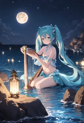 masterpiece, best quality, extremely detailed, anime, girl, Hatsune Miku, VOCALOID, turquoise blue long twintails, beautiful clear blue eyes, mermaid in a blue bikini swimsuit, transparent water in the sea, mermaid, beautiful girl, cute, gentle smile, night, ethereal glow of fireflies, bubbles of water, sparkling soap bubbles, underwater, sunken ship, fantastical, mysterious, fantasy