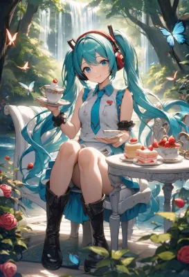 masterpiece, best quality, extremely detailed, anime, girl, skirt, VOCALOID, Hatsune Miku, turquoise blue long twintails, blue eyes, miniskirt, tie, headphones, sleeveless, black arm covers, black long boots, beautiful girl, cute, smiling, sunlight filtering through the forest, red roses blooming, waterfall, water, sitting on a white chair, ice cream on a white table, summer.