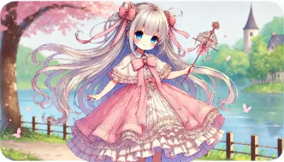 プロンプト: 「1人のとても小柄な女性。とても背が低く、とても長く明るい金髪、とても長くまっすぐ流れるようなストレートヘア。身長はとても低く、パステルピンクを基調とした魔法少女風のロングドレスを着ている。フリルとレースがふんだんにあしらわれ、胸元には大きなリボン。可愛らしい魔法の杖を片手に持っている。優しい笑顔と大きな青い瞳が印象的。非常に小柄な姿で、湖畔の散歩道を歩いている。非常に長く明るい金髪のストレートヘアが広がっている。とても背が低い。とても小柄な後ろ姿。全身が描かれており、アニメスタイルで繊細かつ美しいイラスト。解像度1024x1792」を描いて。