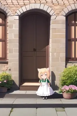 cat girl wearing (japanese dirndl in front of navel,midriff,navel cut out:1.2), spring, (Poland, Czech, Vienna:1.2), cat girl,floating petals, flagstone, brickwork, Mild and innocent
