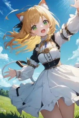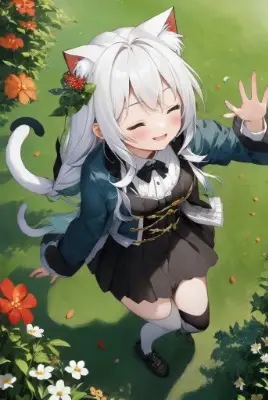 (best quality, masterpiece:1.2),2girl,outdoors, cat ears, looking up, shy, reaching out(from above), white hair, long hair, flower petals, greenery, open jacket, open eyes, skirt, stockings, shoes, smiling with closed mouth, blush