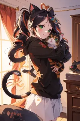 Masterpiece, Ultra-detailed, Best quality, High Resolution, 8K Wallpaper, Super fine, Absurdres, 2D, Add-Layer, Illustration, 1 girl, Long wavy hair, Multicolored hair,Green eyes, Hoodie , in a decorated room,Looking at viewer, Happy laughing, Flat chest , ((Hug beloved charmy small pet cat:1.5))