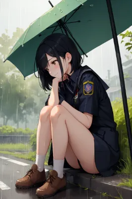 A slender college woman with black hair, bob hair and black eyes, solo, sitting under a small roadside shelter, trying to avoid the heavy rain. She hugs her knees, her uniform slightly damp, looking down with a lonely, sad smile. Raindrops create a calming yet melancholic atmosphere. The contrast between her cuteness and vulnerability is striking