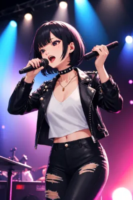 Black hair, bob cut, black eyes, 20 years old, college student, slender build with a small chest, a microphone, singing. she is a space-themed idol who puts on a space pirate costume for an adventurous performance. The starry sky-like stage set invites the audience to enter a different world.