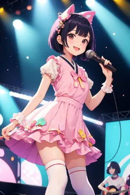 a young Japanese woman, 20 years old, slender body, black bob haircut, black eyes, wearing a black leather jacket, ripped skinny jeans, and a studded choker, singing passionately on stage, holding a microphone, surrounded by dim concert lighting, rock band performance, stylish and cool expression