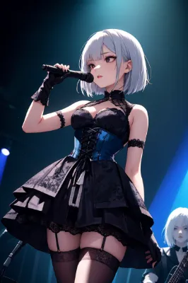 a young Japanese woman, 20 years old, slender body, black bob haircut, black eyes, wearing a pastel pink frilly dress, white knee-high socks, cute accessories, holding a microphone with a bright smile, standing on stage with colorful spotlights, cheerful and energetic pose, J-pop concert atmosphere