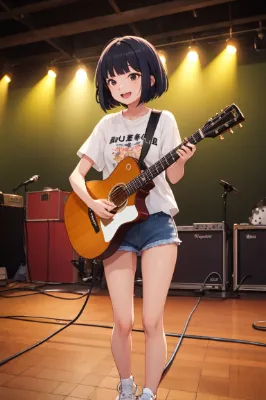 a young Japanese woman, 20 years old, slender body, black bob haircut, black eyes, wearing a gothic-style black corset dress, lace gloves, dark makeup, silver accessories, standing under a moody blue stage light, holding a microphone gracefully, melancholic yet elegant, gothic rock performance