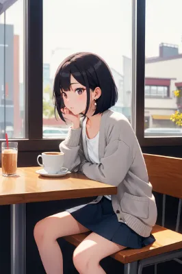 The woman is black hair, bob cut, black eyes, 20 years old, college student, small breasted, slender girl, Japanese. She is wearing a casual denim jacket, white T-shirt, and black skinny jeans. She enjoys (a matcha parfait) in a relaxing cafe.