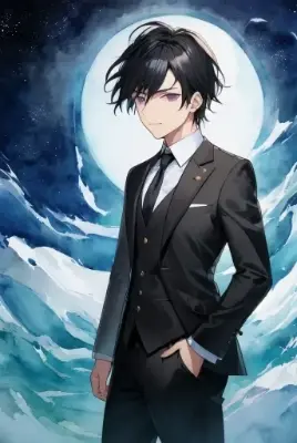 男性、大人年齢30代、目は紫色、つり目でクール、整った黒髪短髪、服は黒スーツ、黒ネクタイ、白いシャツ、クールな印象の男性、魔法を使ってる