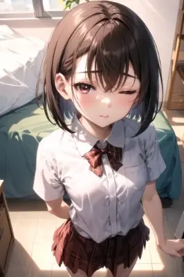 very cute and beautiful girl, (5'tall:1.3), round face, slanted maroon eyes, long eyelashes, pinky lip, short brown bob hair, tiny breasts, solo,