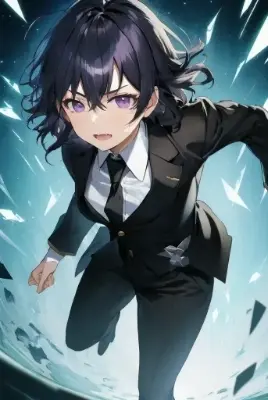 男子、高校生、髪色ブラウン、短髪ショートヘア、目は黄緑、カジュアルな私服、襟が着物で半袖のシャツ、ズボン、全身、森林