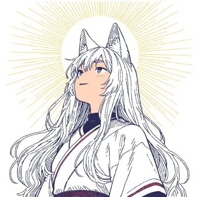 anime, flat colors, crayon drawing, cinematic worm lighting, magic hour, killer queen, beautiful cool dark-skinned girl, wild girl, white japanese miko clothes, silk texture, black neck undershirt, white hair, fox ears, thick eyebrows, happy, heart mark, heart, heart, --sref 421022513::1 --niji 6 --stylize 400