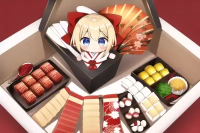 masterpiece, best quality, 2girls_A_and_B,A gril_have_blonde hair_short_hair_{hair bow}_blue eyes_ flat chest_frced smile_quilted coat,{master piece}, {extremely detailed},highly detailed,B girl_have_small breasts_very long black hair_quilted coat},osechi japanese New Year dishes,Japanese New Year Food,in multi-tiered box, holding chopsticks,C