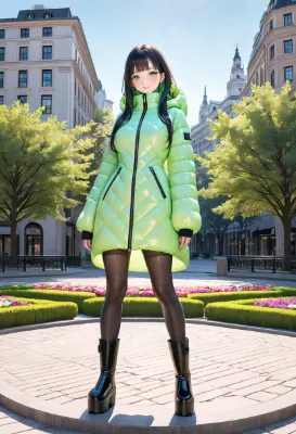 (photorealistic:1.4), (RAW photo), masterpiece, best quality, extremely detailed, lady, neat and clean, elegant, polite, (shy:0.9), black long hair, almond eyes, (smile:0.9), slim fit, closed zipper, (shiny pinkish light purple short puffer down jacket), ((navy sailor collar)), pleated skirt, platform long rubber boots, fashionable cafe, sit on chair, cherry blossom branch in vase, good view, cold sunny day
