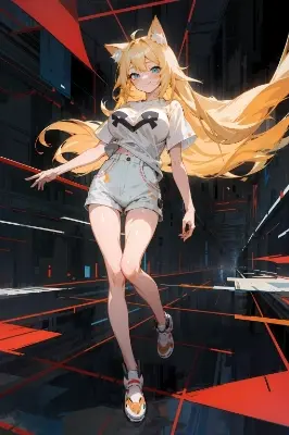 anime art, glitch art, cyber space, one girl with purple long hair, cat ear, big breasts,full body, black blouse,full body, looking at viewrer, smile,moba style, <lora:flatBG:-0.4> ,<lora:flat2:0.2>,black shoes,