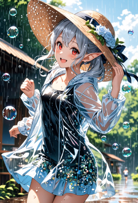 8K,((perfectly aligned fingers)),((cinematiclight,masterpiece,best quality,Ultra extremely detailed,perfect anatomy,detailed,high-resolution,highres,extremely detailed,sharp focus:1.5)),((zoomed-up)),(((high-contrast:1.6,strong back-light, flower print ,young girl elf wearing see-through glossy decoration glitter gorgeous gothic swiming-wear to with brilliant sequins,wearing Transparent raincoat,short skirt, very large gothic ribbon ,white underwear ))),looking at viewer:1.5,((extra detailed wet red Eyes with reflection)), glitter waving shining messy:1.5, ((waving very long pearl white hair messy twin-tails with curly)),elf ear with big earrings ,wetting face,blush,lipstick,Skin Gloss and skin is soaking wet, wet-lip,big hip,open wide mouth,smile,small breasts,armpit ,Sweat,looking at viewer,Skin Gloss legs, wearing sun hat, ((falling flat)),raincoat,BREAK,((Rainy Season,flower storm)),BREAK,((big Bubbles)),BREAK,(blooming white roses),BREAK,(strong Reflection),BREAK,antique Shopping Stalls in see-side)),<lora:hohoaka:1> <lora:make25d_type1_v100:1>,,,,