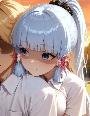 3girls, medium_breasts, (kamisato_ayaka_\(genshin_impact\):0.9), alternate_costume, school_uniform, collared_shirt, short_sleeves, black_scrunchie, (keqing_\(genshin_impact\):0.9),(nilou_\(genshin_impact\):0.9), hug_from_behind, head_on_another's_shoulder, assertive_female, arm_hug, holding_bag, looking_at_another, looking up, BREAK, 1boy, (aether_\(genshin_impact\):0.9), white_shirt, collared_shirt, white_eyes, sweatdrop, open_mouth, wavy_mouth, surprised, male_focus, turn_pale, BREAK, outdoors, school, evening, HDR, 8K, sensitive, (photorealistic, blurry_background, depth_of_field,:1.15) masterpiece,best quality,amazing quality,very aesthetic,absurdres,newest, highres, detailed,