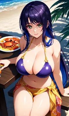 ultra detailed, top quality, masterpiece, aesthetic, beautiful face, beautiful eyes, cute eyes, shiny hair, (4fingers:0.7), 1girl, voluptuous body, large breasts, doakasumi, brown hair, ponytail, hair ribbon, orange eyes, <lora:doakasumi-pdxl-nvwls-v1:0.7>, yellow bandeau, yellow and white plaid pattern, strapless, bandeau bikini, adjusting hair, slender thighs, alone, smile, beach side, in resort area, add more details, <lora:Add_more_details_pony:0.4>, score_9, score_8_up, score_7_up
