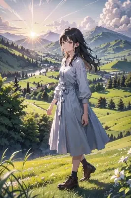On the ground stands a girl, looking up at the sky, watching the airplane. Her face is full of longing and amazement.