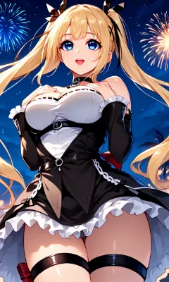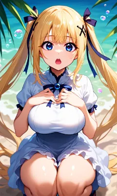 ultra detailed, top quality, masterpiece, aesthetic, beautiful face, beautiful eyes, cute eyes, shiny hair, (4fingers:0.7), 1girl, voluptuous body, large breasts, honoka, pink hair, medium hair, one side up, hair ornament, red eyes, <lora:doahonoka_pony:0.7>, blue bikini, water color marble, happy, smile, open mouth, cowboy shot, bent over, arms breasts together, beachside, in resort area, add more details, <lora:Add_more_details_pony:0.4>, score_9, score_8_up, score_7_up